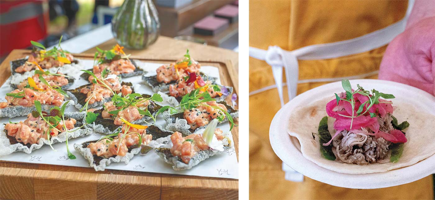 Wine gets major billing, and choices abound, including pours from national vineyards such as California’s Silver Oak and awardwinning Texas wineries such as William Chris Vineyards in the Hill Country. The festival is the perfect opportunity to sip a new favorite. Local brewers and distillers are especially prized at “Tacos + Tequila.” Seek out cool cocktail lounge spaces for specialty drinks, and, if you’re attending the Sunday brunch, find the coffee vendor stat. To stay hydrated, take advantage of the free iced bottled water in big barrels strategically placed throughout the venue.